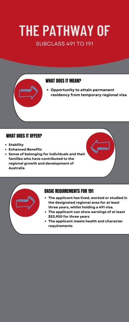 The proposed changes to the Subclass 491 visa present both challenges and opportunities for Australia’s regional development. Addressing infrastructure needs, aligning skills with regional demands, creating employment opportunities, fostering social integration, and effectively marketing regional areas are crucial aspects that need to be considered. By addressing these challenges, the proposed changes can unlock the potential for skilled migrants to contribute to regional growth, bridge skill gaps, and create vibrant, sustainable communities that benefit both migrants and regional Australia as a whole. Subclass 491 visa holders can apply for permanent residency (Subclass 191) after meeting post –grant requirements.