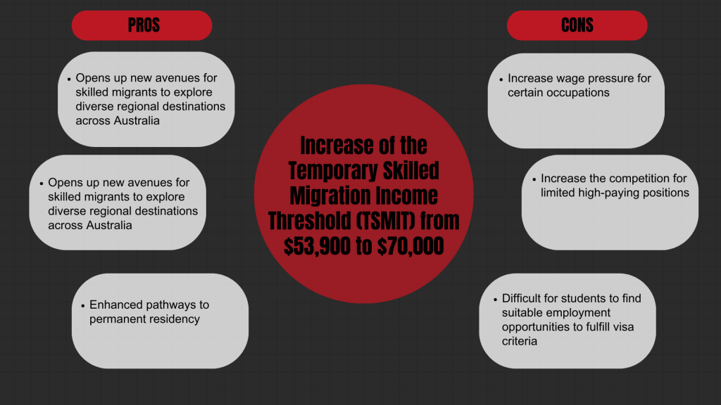 If the Temporary Skilled Migration Income Threshold is raised to $70,000, it would likely have several impacts. Raising the income threshold could potentially increase wage pressure for certain occupations. Employers may need to offer higher salaries to attract skilled migrants who meet the new threshold. In addition to that, this higher threshold may require students to secure higher-paying jobs in order to meet the visa requirements, potentially narrowing their job prospects in regional areas. It may also increase the competition for limited high-paying positions and make it more difficult for students to find suitable employment opportunities to fulfill visa criteria.